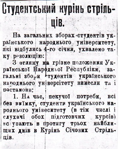 Постанова про формування студентського куреня стрільців. Січень 1918